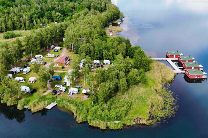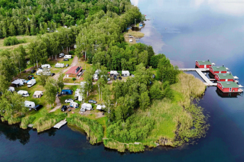 Watersportcamping gelegen aan meer met strand, met een boven- en benedengedeelte. Boven tussen de bomen en beneden aan het water. Schoon sanitair. Gloednieuw (2023) luxe sanitair op het benedengedeelte van de camping.
