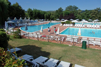 Camping in de Valdambra. De plaatsen zijn omzoomd door laurierhagen met veel schaduw en hebben een eigen fonteintje. De camping heeft 3 grote zwembaden.