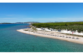 Camping bij , Dalmatië in Kroatië. Direct aan zee met privé kiezelstrand. Nieuwe stacaravans tussen de olijfbomen. Rustige, kleinschalige camping met modern comfort. Wandel langs de zee naar dorpje Jadrija.