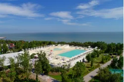Rosapineta Camping Village Camping aan de kust: duik van zwembad in zeeVanuit de zwembaden van deze camping zie je het al liggen: het strand van de Italiaanse badplaats Rosolina Mare.