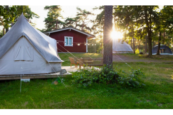 Camping bij , South-Sweden in Zweden. Directe toegang tot het zandstrand. Springkussen, speeltuin en adventure golf. Restaurant en winkel op het plein. Kindvriendelijke camping.