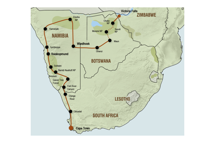 Deze Lodge Safari brengt u van Kaapstad tot bij de machtige Victoria Falls. Deze rondreis in een klein gezelschap van maximaal 12 personen is een uitstekende manier om al het spectaculaire van deze regio tijdens één reis te zien. In een robuuste 4x4 truck voorzien van airco, toilet en comfortabele vliegtuigstoelen kunt u genieten van het landschap, het wildleven, de cultuur en het avontuur. U bezoekt o.a. de Fish River Canyon, Sossusvlei, Swakopmund en het Etosha National Park. Vandaar reist u via Maun, vanwaar u Okavango Delta ontdekt naar Chobe National Park in Botswana. Deze kleinschalige groepsreis eindigt tenslotte in Zimbabwe, waar u de machtige Victoria watervallen kunt bewonderen! U verblijft tijdens deze Lodge Safari in sfeervolle lodges, hotels, guesthouses of tented camps welke speciaal geselecteerd zijn op de bijzondere ligging zoals in een National Park of gelegen zijn aan een rivier.