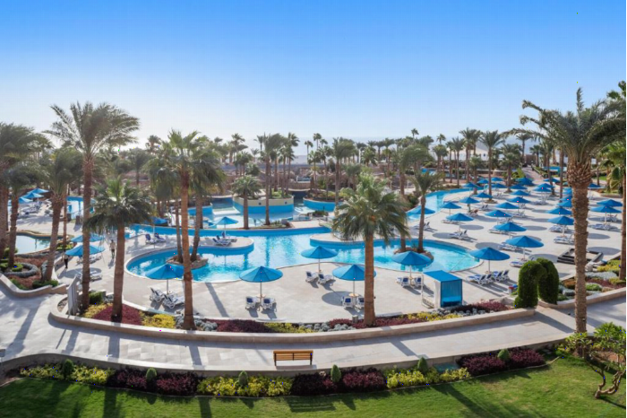 LiggingHet Pickalbatros Golf Beach Resort in Sharm El Sheikh is een luxe vijfsterrenresort dat zich uitstrekt langs de kust van de Rode Zee in de wijk Shark's Bay. Naar de luchthaven Sharm el-Sheik is het ongeveer 15 km.HotelfaciliteitenHet resort beschikt over een privéstrand, een 18-holes golfbaan, twee zwembaden met waterglijbanen en een lazy river, evenals vier tennisbanen. Het resort biedt ook een volledig uitgerust fitnesscentrum, een spa voor ontspannende behandelingen, en een kinderclub met activiteiten voor jongere gasten.KamersAlle kamers en suites zijn uitgerust met moderne voorzieningen zoals airconditioning, flatscreen-tv's, minibars, kluisjes, en gratis Wi-Fi. Gasten kunnen genieten van de comfortabele en stijlvolle inrichting, evenals van de prachtige uitzichten op de tuinen, het zwembad of de zee. Eten en drinkenVoor culinaire liefhebbers zijn er zeven restaurants die een verscheidenheid aan internationale keukens aanbieden, waaronder Italiaanse, Aziatische en lokale gerechten. Daarnaast zijn er verschillende bars waar gasten kunnen genieten van verfrissende drankjes en snacks.