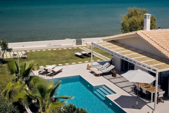 Ontwaak met direct zeezicht in deze moderne villa van 100m² pal aan de kust bij Argassi. Geniet vanuit elke kamer, of vanaf het privézwembad (26m²) met ligbedden, van een verfrissende zeebries en een eindeloze horizon. De villa biedt comfort voor 8 gasten met drie slaapkamers, waarvan één met eigen badkamer, een extra badkamer en slaapbanken in de woonkamer. Kook in de volledig uitgeruste keuken, dineer op het panoramische terras, of loop in 2 minuten naar het zandstrand voor een verfrissende duik. Hier ervaar je kustprivacy in optima forma: moderne faciliteiten, een verkoelend zwembad en de zee als constante metgezel, perfect voor gezinnen of kleine groepen die rust en strandgemak willen combineren.