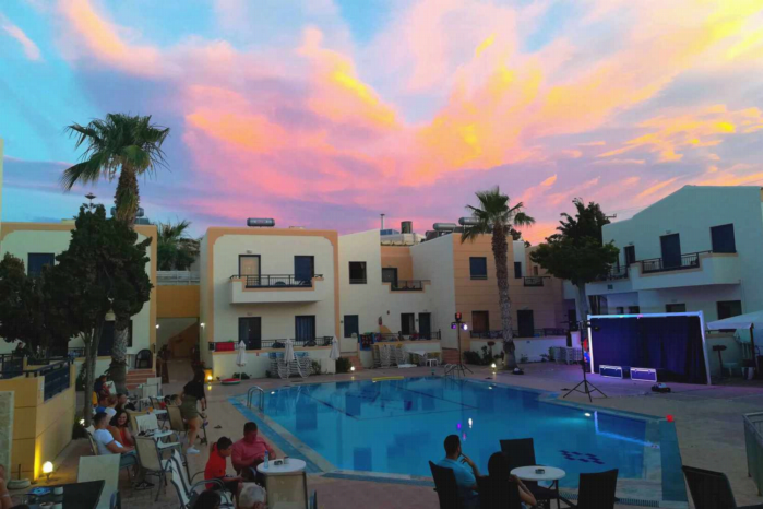 LiggingDit aparthotel bevindt zich in Gouves, slechts een paar tellen verwijderd van het zandstrand. HotelfaciliteitenIn dit hotel met een receptie bevinden zich 45 kamers voor de gasten. Het voorzieningenaanbod van het verblijf bevat een bagagedepot, een kluis en een wisselkantoor. Via Wi-Fi hebben de gasten toegang tot het internet. De tourdesk biedt ondersteuning bij het boeken van excursies. Het aparthotel beschikt over meerdere voor gehandicapten toegankelijke vrijetijdsbestedingen. Rolstoelvriendelijke faciliteiten zijn beschikbaar. In de supermarkt zijn producten voor het dagelijks gebruik verkrijgbaar. Op het terrein van het hotel bevinden zich een mooie tuin en een fraaie speelplaats. Tot de overige voorzieningen van het verblijf behoren een tv-ruimte, een speelkamer en een bibliotheek. De gasten die met de auto komen, kunnen in een garage of op de parkeerplaats (kosteloos) parkeren. Onder de beschikbare voorzieningen bevinden zich een 24-uurs beveiligingsdienst, een oppasservice, een autoverhuur, een medische dienst, een transferservice, roomservice, een wasservice, een muntwasserette en een eigen shuttlebus. Actieve gasten die de omgeving op de fiets willen ontdekken, zullen de fietsverhuur weten te waarderen, fietsparkeerplekken zijn eveneens voorhanden. Ter ondersteuning van het zakendoen is een fax voorhanden. KamersIn de kamers bevinden zich een keuken en een badkamer, voor een aangenaam luchtklimaat zorgt airconditioning. Tot de standaardinrichting van de meeste kamers behoort een balkon. Hun waardevolle spullen kunnen de gasten in een kluis deponeren. In de kitchenette bevinden zich een koelkast en een thee-/koffiezetapparaat. Bovendien zijn een televisie en Wi-Fi (kosteloos) beschikbaar. In de badkamer - uitgerust met een douche - is een föhn voorhanden. Het aparthotel beschikt over gezinskamers en niet-rokerskamers.Sport/entertainmentNaast binnen- en buitenzwembaden is er een zone met kinderzwembaden. Echt optimaal van de vakantie genieten kan op het zonneterras met ligstoelen en parasols. Om buiten in de frisse lucht te sporten biedt het hotel met fietsen/mountainbiken, golfen, vissen en paardrijden verschillende mogelijkheden aan. Met windsurfen, zeilen, catamaranzeilen, snorkelen en duiken voelen zich ook watersportliefhebbers helemaal op hun gemak. De gasten in het verblijf beschikken over vele indoorsportmogelijkheden zoals bijvoorbeeld de fitnessstudio, tafeltennis, biljart, darts, gymnastiek en tafelvoetbal. Tot het wellnessaanbod van het aparthotel behoren een spa en massagebehandelingen. Een animatieprogramma, een miniclub en livemuziek garanderen volop recreatieplezier.  Eten en drinkenEen restaurant, een eetzaal en een bar behoren tot de culinaire faciliteiten. Het hotel biedt halfpension en all-inclusive als boekingsmogelijkheid op het gebied van eten en drinken aan. Iedere dag worden ontbijt en middagmaaltijd geserveerd. Voor speciale wensen worden aangepaste gerechten aangeboden: dieetgerechten en kindermenu's. Daarnaast stelt het verblijf speciale menu's beschikbaar. CreditcardsHet aparthotel accepteert MasterCard als betaalmiddel.