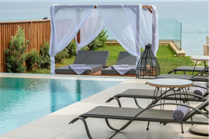 Wordt wakker met een prachtig uitzicht op de Ionische zee in deze 120 m² strandvilla direct aan Psarou Beach in Ammoudi. Stap vanuit je privézwembad zo de trap af naar het strand of geniet vanaf de veranda's van onbelemmerde zeegezichten. De villa biedt comfort voor zes gasten met drie slaapkamers en drie badkamers. Kook met verse lokale producten in de volledig uitgeruste keuken, dineer onder de sterren bij de barbecue of zoek verfrissing in het zwembad omringd door ligbedden en parasols. Met een tuin vol rust en directe strandtoegang combineert Casa Palmera exclusieve privacy en onmiddellijke vakantievreugde, waar het ruisen van de golven je constante metgezel is en de gezelligheid van Zakynthos binnen handbereik blijft met je auto.