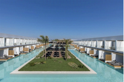 Hotel D'Andrea Lagoon Suites biedt 80 luxe suites in Marmari, waar natuurlijke houtaccenten en fluweelzachte materialen een harmonieuze sfeer creëren.