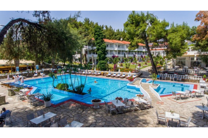 Ontsnap naar het zonnige Halkidiki en verblijf in het sfeervolle Porfi Beach Hotel, direct aan een prachtige zandstrand. Het hotel ligt op een rustige locatie, omringd door pijnbomen en op slechts enkele minuten rijden van het charmante dorpje Nikiti. Hier vind je de perfecte mix van ontspanning en Griekse gastvrijheid.Geniet van een verfrissende duik in het grote buitenzwembad of relax op het privéstrand met ligbedden en parasols. Voor de sportievelingen zijn er tennisbanen en watersportmogelijkheden, terwijl kinderen zich vermaken in de speeltuin. 's Avonds proef je heerlijke mediterrane gerechten in het restaurant en sluit je de dag af met een drankje in de gezellige bar.Porfi Beach Hotel is dé plek voor een ontspannen vakantie onder de Griekse zon!