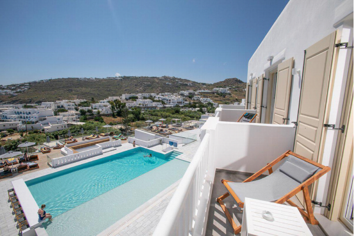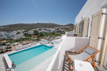 Ben je op zoek naar een luxe verblijf op het prachtige eiland Mykonos? Het 4-sterren The George Hotel, gelegen in Platis Yialos, biedt een authentieke Cycladische sfeer met witgekalkte gebouwen en schilderachtige uitzichten op de Egeïsche Zee. Het hotel beschikt over 41 elegant ingerichte kamers, elk voorzien van moderne gemakken en een balkon met uitzicht op zee. Ontspan bij het zwembad met comfortabele ligbedden of geniet van een ontbijt op het terras met panoramisch zeezicht. Voor een verfrissend drankje kun je terecht bij de cocktail-snackbar, omringd door veranda's met adembenemende uitzichten. Met een eigen parkeerplaats en gratis WiFi in alle ruimtes, zorgt The George Hotel voor een zorgeloos verblijf. Het beroemde Platis Gialos-strand ligt op slechts enkele meters afstand, en het bruisende Mykonos-stad (Chora) bevindt zich op 4 kilometer afstand. Boek nu je verblijf bij D-reizen en ervaar de charme van The George Hotel Mykonos!