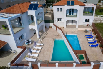 Deze moderne villa's in het levendige centrum van Tsilivi, bieden maximale flexibiliteit: boek één villa voor 6 personen of combineer beide via de tussendeur voor groepen tot 12. Elke villa heeft twee verdiepingen met een open woonkeuken beneden, een tweepersoonsslaapkamer, badkamer en een bovenverdieping met extra slaapruimte plus een ruim balkon met tuinzicht. Jullie eigen domein omvat elk een verfrissend privézwembad, ligbedden en parkeerplaats. Na een dag strand of winkelen in het centrum (op loopafstand) geniet je bij thuiskomst van je eigen privéoase: zwemmen bij avondlicht, dineren op de veranda of ontspannen op het balkon. Met airco, wifi en wasmachines ervaar je zorgeloos vakantiegeluk, ideaal voor families die vrijheid én nabijheid zoeken, met de zee altijd binnen handbereik.