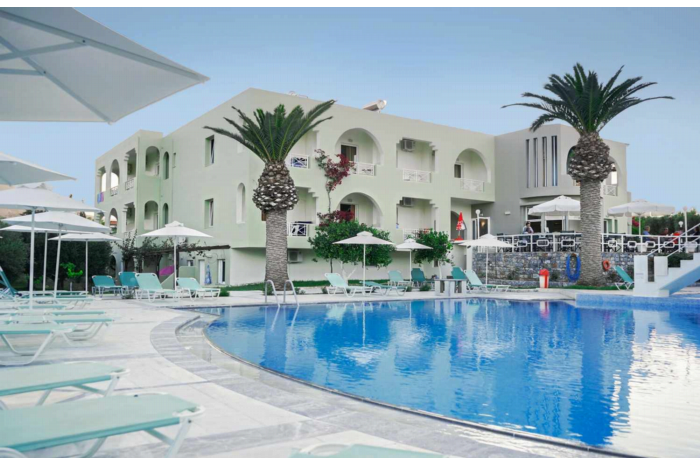 LiggingHet appartementenhotel bevindt zich in Georgioupoli, op circa 1 km van het strand, op een rustige plek. De luchthaven Heraklion (HER) ligt op ongeveer 100 km afstand. HotelfaciliteitenHet aparthotel beschikt over 11 appartementen en 47 studio's en over een lift. Het vriendelijke personeel aan de receptie is graag bij alle vragen behulpzaam. De gasten van het hotel kunnen van een bagagedepot, een kluis, een autoverhuur, een medische dienst, een fax, een rookmelder en een lounge gebruikmaken. Wi-Fi is kosteloos aanwezig. De tourdesk biedt ondersteuning bij het boeken van excursies. Op het terrein van het verblijf bevinden zich een mooie tuin en een fraaie speelplaats. De gasten die met de auto komen, kunnen in een garage (tegen toeslag) of op de parkeerplaats (kosteloos) parkeren. De omgeving kan door de aanwezigheid van de fietsverhuur ook op de fiets worden verkend. KamersAirconditioning (tegen toeslag) en een individueel regelbare verwarming zorgen voor een aangename luchtcirculatie in de kamers. In de meeste kamers is een balkon of een terras aanwezig. Extra bedden en babybedjes zijn op aanvraag en tegen betaling voorhanden. Hun waardevolle spullen kunnen de gasten tegen betaling in een kluis opbergen. In de kitchenette behoren een mini-koelkast en een fornuis tot de standaardvoorzieningen. Voor vakantiecomfort zorgen een telefoon met directe buitenlijn, satelliettelevisie en Wi-Fi (kosteloos). In de badkamers vinden de gasten een föhn. Het aparthotel beschikt over gezinskamers en niet-rokerskamers.Sport/entertainmentVoor afwisselende recreatie en vrijetijdsbesteding staan de sport- en amusementsmogelijkheden van het hotel ter beschikking. Terwijl de volwassenen in het openluchtzwembad een paar baantjes trekken, komen de kinderen in het pierenbadje aan hun trekken. Echt optimaal van de vakantie genieten kan op het zonneterras met ligstoelen en parasols. In de (snack-) bar worden verfrissende drankjes aangeboden. Tegen betaling kunnen de gasten van fietsen/mountainbiken gebruikmaken. Kinderen worden in de miniclub liefdevol opgevangen.  Eten en drinkenHet horecagedeelte is uitgerust met een restaurant en een bar. Verfrissende drankjes aan de strandbar staan garant voor feelgood momenten. Het verblijf biedt een overnachting incl. ontbijt en halfpension als boekingsmogelijkheid op het gebied van eten en drinken aan. Iedere dag worden een continentaal ontbijtbuffet en een veelzijdig avondbuffet geserveerd. Bovendien staan ook dieetgerechten, vegetarische gerechten, kindermenu's en veganistische maaltijden op de menukaart.