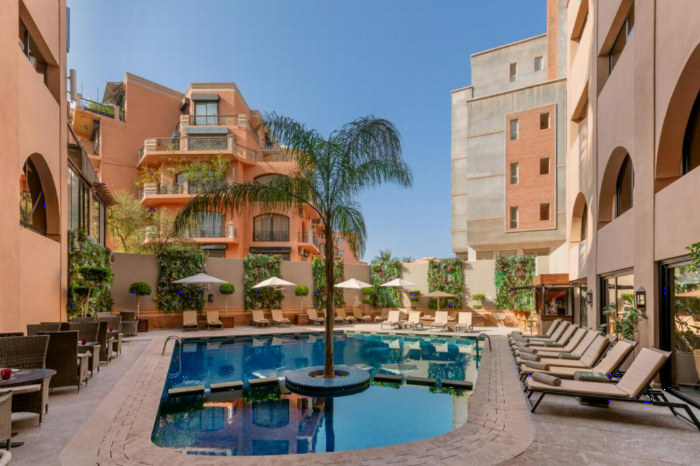 LiggingHivernage Hotel & Spa ligt in de chique wijk Hivernage in Marrakech, op wandelafstand van de medina en de souks. Het bevindt zich dicht bij Bab Jdid, een van de stadspoorten, en je hebt uitzicht op de Agdal-tuinen en het Atlasgebergte. De luchthaven Menara is ongeveer tien minuten rijden. HotelfaciliteitenHet hotel heeft 5-sterren en biedt een groot wellness-gedeelte van zo'n 600 m² met luxe hammams, sauna, fitnessruimte, jacuzzi, schoonheidssalon en een Barber Shop. Er is een buitenzwembad, een bar op het dak (MySky Lounge Bar) en meerdere horecavoorzieningen waaronder een restaurant met gastronomische keuken. Verder is er gratis wifi, parkeergelegenheid, roomservice, een 24-uursreceptie en faciliteiten voor vergaderingen. KamersEr zijn ongeveer 85 kamers en suites, waarvan sommige met balkon of terras. Kamers zijn modern ingericht met Marokkaanse accenten, met airconditioning, flatscreen-tv, minibar, koffie- en thee-faciliteiten. De grotere suites hebben extra's zoals een salon, haard/sauna/spa-bad in sommige gevallen.Sport/entertainmentVoor ontspanning is er het zwembad, ligstoelen en zonneterras. Verder kun je terecht bij de spa voor massages, hammam- en thermaalrituelen. Er is een fitnesscentrum. Voor wie Marrakech wil verkennen: diverse bezienswaardigheden zijn op loop- of korte taxiafstand, en het hotel kan bij uitstapjes of vervoer assisteren.  Eten en drinkenHet hotel heeft ten minste twee restaurants, waarvan La Table du Marché als hoofdrestaurant bekendstaat met verfijnde gerechten bereid met lokale ingrediënten. Daarnaast is er een bar/lounge, een rooftop bar waar je lichte maaltijden en drankjes kunt krijgen, en een koffie-/bakery-winkel. Ontbijt wordt in buffetvorm geserveerd, en maaltijden kunnen ook buiten op het terras genuttigd worden.