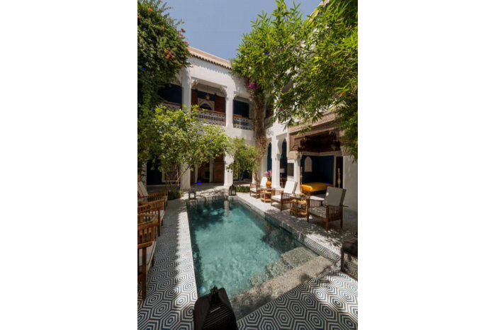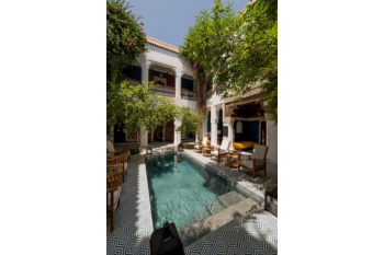 LiggingRiad Les Yeux Bleus ligt in de medina, in de wijk Bab Doukkala, op ongeveer tien minuten lopen van het beroemde Jemaa el Fna-plein. Het Bahia-paleis is op circa 1 kilometer afstand, de Majorelle-tuinen op zo'n 2 km, en de luchthaven Menara is in zo'n 20 minuten rijden te bereiken. HotelfaciliteitenDe riad heeft een buitenzwembad en een Turks bad (hammam), een welnessgedeelte waar massages mogelijk zijn, een dakterras met bar, twee patio's, een bibliotheek, salons om te ontspannen, en een 24-uursreceptie. Verder is er gratis WiFi in alle gedeeltes, vervoer van/naar de luchthaven mogelijk, en mogelijkheden om excursies of uitstapjes te regelen. KamersDe kamers zijn comfortabel ingericht en voorzien van airconditioning. Sommige kamers hebben een open haard voor extra sfeer. De badkamers hebben een douche of bad, afhankelijk van het kamertype. Er zijn zowel standaardkamers als luxere kamertypes beschikbaar, elk met eigen stijl inrichting.Sport/entertainmentHoewel er geen uitgebreide sportfaciliteiten zijn zoals grote fitnessruimtes of intensieve sportprogramma's, biedt de riad voldoende ontspanning: het zwembad is ideaal om af te koelen, de hammam en massages zorgen voor wellness, en het dakterras is perfect voor rust en uitzicht. De sfeer is kalm en geschikt voor bezoekers die willen uitrusten na een dag verkennen. Eten en drinkenElke ochtend wordt er een ontbijt geserveerd. Er is een restaurant in de riad dat zowel Marokkaanse gerechten als internationale opties biedt. Voor gasten die liever in rust eten, is roomservice beschikbaar. Daarnaast zijn drankjes te krijgen aan de bar op het dakterras.
