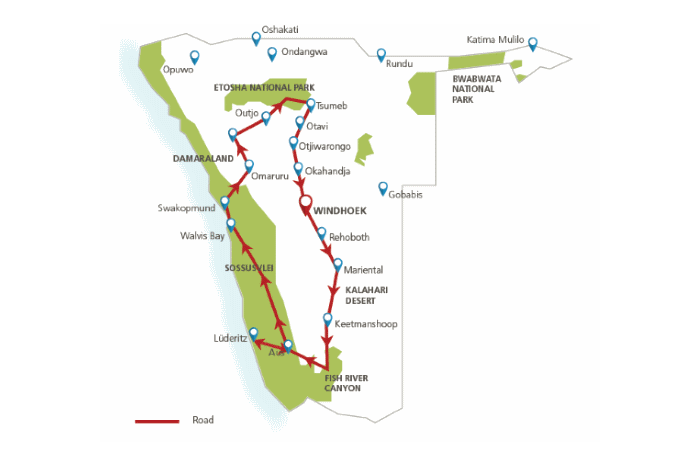 Circa 2 ½ week individueel door Namibië reizen maar dan wel alle hoogtepunten zien? Dat kan tijdens deze complete rondreis per auto door Namibië. U bezoekt de indrukwekkende Fish River Canyon, de zandduinen bij Sossusvlei en maakt safari's in het Etosha National Park. Onderweg bezoekt u ook nog de kustplaatsjes Lüderitz en Swakopmund, alsmede Kalahari woestijn & Twyfelfontein. Na terugkomst kunt u beamen dat Namibië een onvergetelijke bestemming is.