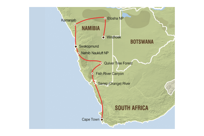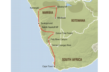 Enkele reis van Windhoek naar Kaapstad in een groepsreis met maximaal 12 personen. U reist per luxe 4x4 safaritruck naar Etosha waar u volop kunt genieten van gamedrives. Via de beroemde "White Lady" rotsschilderingen en de spectaculair uitzichten over de vlaktes van Damaraland kunt u bijkomen in de koloniale badplaats Swakopmund. Het beklimmen van de Dune 45 bij Sossusvlei is een volgend hoogtepuntje, gevolgd door de Fish River Canyon met prachtige zonsopkomst. Via Orange rivier en Cederbergen eindigen we de groepsreis in Kaapstad.