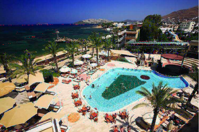 LiggingDit resort, ideaal voor strandvakantiegangers en gezinnen, bevindt zich direct aan de zee, in Turgutreis, het centrum van Turgutreis bereikt men na ongeveer 1 km. De dichtstbijzijnde luchthaven is Bodrum - Milas - Mugla (BJV) en bevindt zich op ongeveer 55 km afstand. HotelfaciliteitenDit resort met een receptie beschikt over 248 kamers. In het verblijf is Wi-Fi voorhanden (kosteloos). Voor filmliefhebbers heet het in de bioscoop: "En…actie!". Er zijn ook winkels. Op het terrein van het complex bevinden zich een mooie tuin en een fraaie speelplaats. Tot de overige voorzieningen van het resort behoort een tv-ruimte. Wie met de auto komt, kan hem op het parkeerterrein van het verblijf parkeren. Onder de beschikbare voorzieningen bevinden zich een oppasservice, een autoverhuur, een medische dienst, een roomservice tegen betaling, een wasservice en een kapper. Bij het zakendoen kan van het businesscenter gebruik worden gemaakt en staat een fax ter beschikking. Lezingen, presentaties of congressen kunnen worden georganiseerd in een van de 2 conferentieruimtes. KamersVoor een aangename luchtcirculatie in de kamers zorgt airconditioning. De meeste kamers hebben een balkon. De gasten kunnen heerlijk slapen op een slaapbank. Bovendien zijn een kluis, een minibar en een bureau beschikbaar. Tot de extraatjes van de kamers behoort een thee-/koffiezetapparaat. Een telefoon met directe buitenlijn, een flatscreen-tv met satellietzenders en Wi-Fi (kosteloos) ronden het serviceaanbod af. In de wooneenheden staan pantoffels klaar voor de gasten. De badkamers beschikken over een douche, een bad en een babybadje. Een föhn en een telefoon zijn voor het gemak van de gasten beschikbaar. Voor extra comfort in de badkamers zorgen cosmetische producten. Rolstoelvriendelijke kamers kunnen worden geboekt. Voor ouders met kinderen zijn gezinskamers beschikbaar.Sport/entertainmentEen openluchtzwembad en een overdekt zwembad nodigen uit tot ontspannen zwemplezier. In een pierenbadje kunnen kinderen zich heerlijk uitleven. Op het zonneterras nodigen ligstoelen onder parasols tot ontspanning uit. In de (snack-) bar worden verfrissende drankjes aangeboden. Wie lekker wil bewegen, kan van jeu de boules, beachvolleybal en midgetgolf genieten. Er is keuze uit verschillende sporten waaronder watersportmogelijkheden zoals waterfietsen, kanovaren, aquarobics en aquafitness en tegen betaling snorkelen. Het resort heeft in het indoorgedeelte ook veel activiteiten voor sportliefhebbers in petto zoals een fitnessstudio, tafeltennis, badminton, biljart, darts, yoga en aerobics. Het verblijf beschikt over een wellnessgedeelte met een sauna en een stoombad en ook - tegen een extra toeslag - een hamam, een beautyfarm en massagebehandelingen. Tot de andere vrijetijdsmogelijkheden horen een miniclub, een minidisco, livemuziek en een disco.  Eten en drinkenEen koffiehuis, een bar en een lobbybar behoren tot de culinaire faciliteiten. Een gemoedelijke sfeer en lekkere gerechten krijgen de gasten in 4 niet-roker restaurants (kinderstoelen zijn voorhanden) voorgeschoteld. Er kan een all-inclusive special deal worden geboekt. Een uitgebreid ontbijtbuffet (ook voor vroege vogels en uitslapers) stimulereert uit bed te komen. 's Middags en 's avonds maken de gasten gebruik van het buffet. Dieetgerechten, vegetarische gerechten en kindermenu's worden op aanvraag bereid. Babyvoeding zorgt voor het welzijn van de kleintjes. Daarnaast stelt het resort snacks beschikbaar. Alcoholische en alcoholvrije dranken zijn voor de gasten inclusief. CreditcardsDe volgende creditcards worden in het verblijf geaccepteerd: Visa en MasterCard.