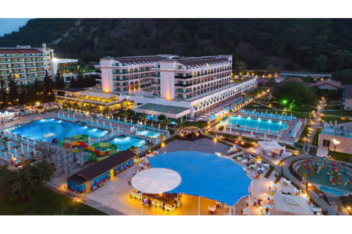 LiggingDit resort ligt direct aan het strand, centraal in Kemer. HotelfaciliteitenHet vriendelijke personeel aan de receptie is graag bij alle vragen behulpzaam. Tot de faciliteiten van het complex behoren een bagagedepot en een kluis. In het verblijf is Wi-Fi verkrijgbaar. Het resort beschikt over verschillende faciliteiten die voor gehandicapten toegankelijk zijn. Het verblijf beschikt over faciliteiten voor rolstoelgebruikers en een lift. Naast een supermarkt zijn andere winkels voorhanden. Op het terrein van het complex bevinden zich een mooie tuin en een fraaie speelplaats. Tot de overige voorzieningen van het resort behoort een krantenkiosk. Wie met de auto komt, kan hem (kosteloos) op het parkeerterrein van het verblijf parkeren. Onder de beschikbare voorzieningen bevinden zich een 24-uurs beveiligingsdienst, een oppasservice, een kinderopvang, een autoverhuur, een medische dienst, roomservice, een wekdienst, een wasservice, een kapper en een muntwasserette. Sportieve gasten die het omliggende landschap op de fiets willen verkennen, zullen de fietsverhuur op prijs stellen. Ter ondersteuning van het zakendoen is een fax voorhanden. KamersAirconditioning en een verwarming zorgen voor een aangename luchtcirculatie in de kamers. De gasten kunnen vanaf het balkon of het terras van het uitzicht op zee genieten. De kamers beschikken over een tweepersoonsbed of een kingsize bed. Er zijn aparte slaapkamers aanwezig. Voor de jongste gasten staan kinderbedjes klaar. Bovendien zijn een kluis en een minibar beschikbaar. Ook een thee-/koffiezetapparaat behoort tot de standaardvoorzieningen. Een broekenpers is voor het extra comfort van de gasten verkrijgbaar. Bovendien zijn een telefoon, een flatscreen-tv met satellietzenders en Wi-Fi (kosteloos) beschikbaar. In de badkamer, uitgerust met een douche en een bubbelbad, vinden de gasten een föhn. Rolstoelvriendelijke kamers kunnen worden geboekt. Het resort beschikt over gezinskamers en niet-rokerskamers.Sport/entertainmentNaast binnen- en buitenzwembaden is er een zone met kinderzwembaden. Pure ontspanning in het bubbelbad, plezier op de waterglijbaan en verfrissende drankjes bij de zwembadbar - de gasten zullen veel waterpret hebben. Ligstoelen en parasols garanderen rustgevende uurtjes. Het verblijf biedt een uitvoerig outdoorprogramma met jeu de boules, beachvolleybal en midgetgolf aan en tegen betaling boogschieten. Met jetskiën, bananenboot varen, kanovaren en aquafitness voelen zich ook watersportliefhebbers helemaal op hun gemak. De gasten in het resort beschikken over vele indoorsportmogelijkheden zoals bijvoorbeeld de fitnessstudio, tafeltennis, darts en aerobics. In het verblijf worden diverse wellnessaanbiedingen zoals bijvoorbeeld spa, sauna, een stoombad, hamam, een schoonheidssalon en massagebehandelingen aangeboden. Een animatieprogramma, een miniclub, livemuziek, een disco en een nachtclub garanderen volop recreatieplezier. Eten en drinkenEen restaurant, een koffiehuis en een bar behoren tot de culinaire faciliteiten. Verfrissende drankjes aan de strandbar staan garant voor feelgood momenten. Het resort biedt halfpension en all-inclusive als boekingsmogelijkheid op het gebied van eten en drinken aan. Voor de grote honger en de kleine trek is er keuze uit ontbijt, middagmaaltijd en diner. Indien gewenst worden ook kindermenu's bereid. Daarnaast stelt het verblijf snacks beschikbaar. Het complex beschikt over een assortiment alcoholische en alcoholvrije dranken. CreditcardsDe volgende creditcards worden in het resort geaccepteerd: Visa en MasterCard.