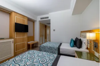 LiggingDit hotel, gelegen in een dynamische, levendige omgeving, begroet de gasten in Belek. HotelfaciliteitenAan de receptie in de ontvangsthal staat meertalig personeel met raad en daad bij. De gasten van de club ontvangen bij aankomst een welkomstdrankje. Het voorzieningenaanbod van het verblijf bevat een bagagedepot en een kluis. In het hotel is Wi-Fi verkrijgbaar. De club beschikt over verschillende faciliteiten die voor gehandicapten toegankelijk zijn. Het verblijf beschikt over faciliteiten voor rolstoelgebruikers en een lift. Naast een supermarkt en een souvenirwinkel zijn andere winkels voorhanden. Op het terrein van het hotel bevinden zich een mooie tuin en een fraaie speelplaats. Tot de overige voorzieningen van de club behoren een tv-ruimte en een speelkamer. Wie met de auto komt, kan hem (kosteloos) op het parkeerterrein van het verblijf parkeren. Onder de beschikbare voorzieningen bevinden zich een 24-uurs beveiligingsdienst, een oppasservice, een kinderopvang, een autoverhuur, een 24-uurs roomservice, een wekdienst, een wasservice, een kapper, een muntwasserette, een piccolo-service en een hotelarts. KamersAirconditioning en een verwarming zorgen voor een aangename luchtcirculatie in de kamers. In de meeste verblijven genieten de gasten van zijwaarts zeezicht van het balkon of het terras. In de kamers met vloerbedekking staat een tweepersoonsbed, een kingsize bed of een slaapbank klaar. Er zijn aparte slaapkamers aanwezig. Ook babybedjes en extra bedden kunnen worden klaargezet. Bovendien zijn een kluis, een minibar en een bureau beschikbaar. Ook een thee-/koffiezetapparaat behoort tot de standaardvoorzieningen. Voor vakantiecomfort zorgen een telefoon, een tv met satelliet-/kabelontvangst en Wi-Fi (kosteloos). In de wooneenheden staan pantoffels klaar voor de gasten. In de badkamer vinden de gasten een douche. Voor het dagelijks gebruik zijn een föhn, badjassen en een telefoon verkrijgbaar. Voor extra comfort in de badkamers zorgen cosmetische producten en een handdoekenset. Bovendien zijn rolstoelvriendelijke kamers met een barrièrevrije badkamer te boeken. Het hotel beschikt over gezinskamers en niet-rokerskamers.Sport/entertainmentNaast binnen- en buitenzwembaden is er een zone met kinderzwembaden. Pure ontspanning in het bubbelbad, plezier op de waterglijbaan en verfrissende drankjes bij de zwembadbar - de gasten zullen veel waterpret hebben. Ook een terras met ligstoelen en parasols is voorhanden. De club biedt een omvangrijk buitensportprogramma met tennis, beachvolleybal, volleybal, basketbal en midgetgolf aan. Tot het watersportprogramma van het verblijf behoren waterskiën, jetskiën, bananenboot varen, aquarobics en aquafitness. De gasten in het hotel beschikken over vele indoorsportmogelijkheden zoals bijvoorbeeld de fitnessstudio, tafeltennis, biljart, darts, bowling, gymnastiek en aerobics. In de club worden diverse wellnessaanbiedingen zoals bijvoorbeeld spa, sauna, hamam en massagebehandelingen aangeboden. Een animatieprogramma, een miniclub, een minidisco, livemuziek, een disco en een nachtclub garanderen volop recreatieplezier. Eten en drinkenEen restaurant, een koffiehuis en een bar behoren tot de culinaire faciliteiten. Verfrissende drankjes aan de strandbar staan garant voor feelgood momenten. Er kan een all-inclusive special deal worden geboekt. De all-inclusive vakantiegangers genieten van bijzondere extraatjes zoals snacks en daarnaast een brede keuze uit alcoholische en alcoholvrije dranken en een gratis vulling van de minibar. Een lekker ontbijt levert energie voor de dag, voor de lunch en het diner gebruiken de gasten het afwisselende buffet. Dieetgerechten, vegetarische gerechten, kindermenu's en halal maaltijden worden op aanvraag bereid. Voor baby's is babyvoeding verkrijgbaar. CreditcardsDe volgende creditcards worden in het verblijf geaccepteerd: Visa en MasterCard.