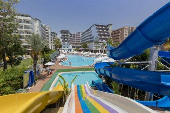 LiggingHoliday Park Resort staat direct aan het kiezelstrand van Okurcalar, met de Middellandse Zee binnen handbereik. In ongeveer vier minuten loop je naar het water, en binnen tien kilometer bereik je het centrum van Okurcalar. Alanya ligt op circa 35†¯km, met de luchthavens van GazipaÅŸa en Antalya op respectievelijk 70-80†¯km afstand, bereikbaar via pendeldiensten.HotelfaciliteitenOp een terrein van ongeveer 11.000†¯m² vind je drie zwembaden (waarvan één binnen) inclusief glijbanen en aparte kinderbaden. Er zijn ligbedden, parasols, een spa met sauna, stoombad, hammam en massages, en een miniclub + speeltuin voor de jongsten. Sportliefhebbers kunnen terecht voor tennis, basketbal, volleybal, fitness en een animatieprogramma met watergym, zumba, darts en biljart. In de avonduren is er entertainment en een eigen discotheek. Verder vind je winkels, kapper, was- en stomerijservice, medische dienst en 24-uursreceptie.KamersHet resort telt ongeveer 212-268 kamers in één gebouw met acht verdiepingen, allemaal met balkon, airconditioning, tv, telefoon en badkamer met douche of bad. Opties zijn inclusief standaardkamers, zij-zeezicht en ruimere familiekamers met meerdere slaapkamers. Minibar en kluisje beschikbaar tegen betaling; babybedjes zijn mogelijk op aanvraag.Sport/entertainmentMet een animatieteam dat overdag activiteiten organiseert en 's avonds shows en discotheek verzorgt, biedt het resort vermaak voor jong en oud. Het waterpark, de glijbanen en de miniclub maken het kindvriendelijk. Watersporten aan het strand (zoals jetski en parasailen) zijn beschikbaar via lokale aanbieders. Aan land kun je sporten als tennis, volleybal, basketbal, mountainbiken of paardrijden.Eten en drinkenAll-inclusive service omvat buffet voor ontbijt, lunch en diner, warme en koude snacks gedurende de dag, patisserie, en nonstop (10-00u) lokale alcoholische en niet-alcoholische dranken. Er is een hoofdrestaurant, een snack- en poolbar, lobbybar en mogelijkheid tot à -la-carte dineren. Dieetwensen kunnen op verzoek worden ingewilligd.