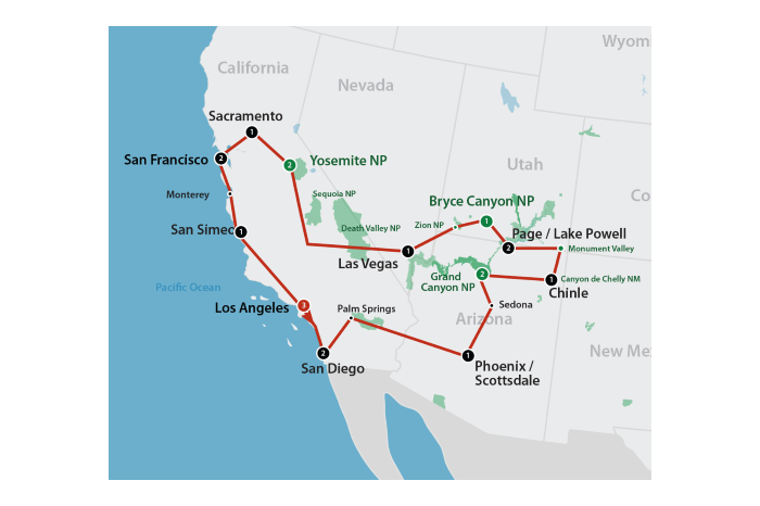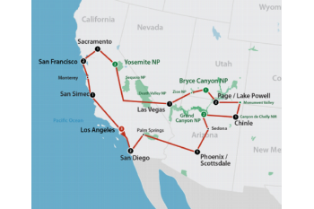 Een autoreis waarbij u in iets minder dan 3 weken de bekendste steden en parken van het westen van Amerika bezoekt. Wij hebben de mooiste locaties voor u uitgezocht; wat denkt u van Grand Canyon, Lake Powell en Yosemite National Park. Om u voldoende tijd te geven verblijft u telkens 2 nachten per locatie. Maar ook voor de steden als San Diego, San Francisco en Los Angeles is er voldoende tijd om te ontdekken. Ook het minder bekende Canyon de Chelly staat op het programma alwaar u het dagelijkse leven van de Navajo indianen kunt beleven. Bryce Canyon, Las Vegas en de 17-Mile Drive zullen echter ook niet ontbreken. Kortom; een reis met vele indrukken waarbij u ruim de tijd heeft op de meest gewilde locaties!