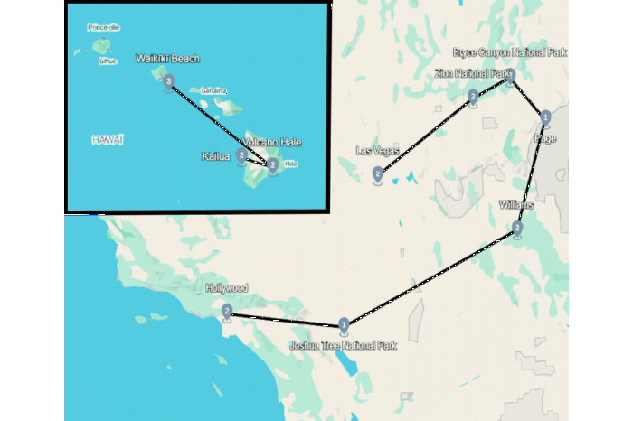 Deze reis begint in het bruisende Las Vegas en voert u langs enkele van de mooiste natuurgebieden van het zuidwesten van de Verenigde Staten. U rijdt eerst naar Zion en Bryce Canyon, waar indrukwekkende rotspartijen en spectaculaire wandelroutes op u wachten. Vervolgens reist u door naar Page, beroemd om de Antelope Canyon en het uitzicht op Horseshoe Bend. In Williams overnacht u vlak bij de majestueuze Grand Canyon, een absoluut hoogtepunt van de reis. Daarna steekt u door naar de woestijn rond Joshua Tree National Park, waar u geniet van de rust en het bijzondere landschap.Na het ruige zuidwesten wisselt u het vasteland in voor het tropische paradijs van Hawaii. U begint op het Big Island, in het ontspannen Kailua Bay, en bezoekt daar ook het indrukwekkende Volcanoes National Park. De reis eindigt in Waikiki, waar u nog even helemaal tot rust komt aan het wereldberoemde strand van Honolulu.
