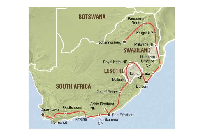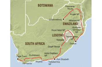 U start deze groepsreis door Zuid-Afrika in Johannesburg en reist op comfortabele wijze naar Kaapstad. Uiteraard bezoekt u het beroemde Krugerpark waar u 3 nachten aan de rand van het park slaapt. Via Swaziland rijdt u naar St. Lucia voor een bootcruise tussen de nijlpaarden en krokodillen. Uiteraard bezoekt u Hluluwe en via Drakensbergen rijdt u naar het ministaatje Lesotho. Tsitsikamma natuurreservaat (met de vele avontuurlijke wandelmogelijkheden) en het Addo Olifant park worden uiteraard niet vergeten. Bij de hoofdplaats van de Kleine Karoo, Oudtshoorn, bezoekt u de Cango Caves en rijdt u via het prachtige binnenland over de Route 62 waar de reis in Kaapstad zal eindigen.