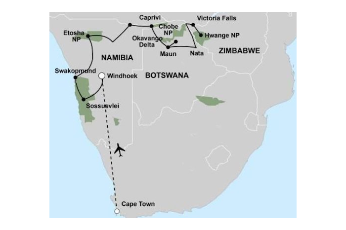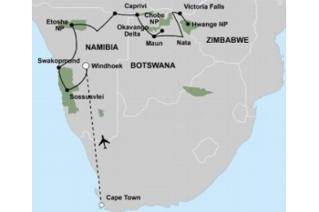 Deze grote ontdekkingsreis brengt u van Kaapstad tot bij de machtige Victoria Falls. Deze populaire groepsrondreis is een goede manier om al het spectaculaire van deze regio tijdens één reis te zien. Geniet van het landschap, de wilde dieren, de cultuur en het avontuur. U bezoekt o.a. Sossusvlei, Swakopmund en het Etosha National Park. Vandaar reist u via de smalle Caprivi strook naar de unieke Okavango Delta en Chobe National Park in Botswana. De groepsreis eindigt ten slotte in Zimbabwe, waar u de Victoria watervallen kunt bewonderen! U verblijft tijdens deze Lodge Safari in sfeervolle lodges, hotels of guesthouses welke speciaal geselecteerd zijn op de bijzondere ligging zoals in een National Park of gelegen zijn aan een rivier.