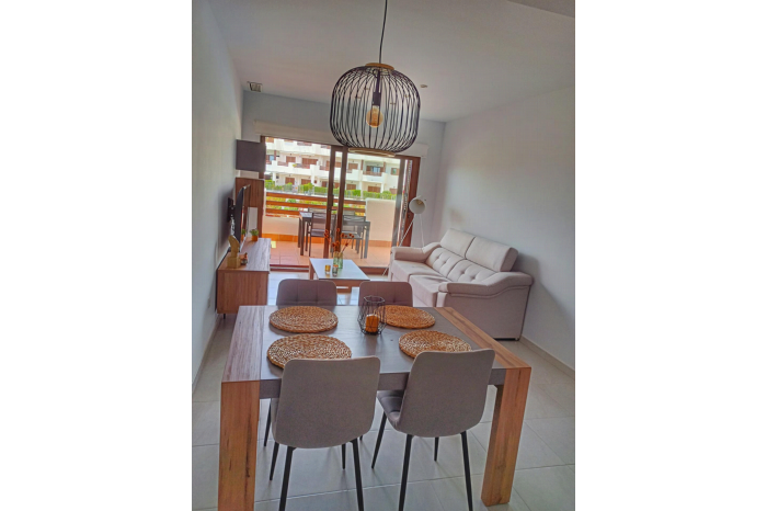 Modern en vrolijk appartement in San Juan de los Terreros, Andalusië, Spanje met gemeenschappelijk zwembad voor 4 personen. Het appartement ligt in een strandresort, in een kust- en woonwijk, dicht bij supermarkten en op 500 meter van het strand.Het appartement heeft 2 slaapkamers en 1 badkamer. De accommodatie biedt een gemeenschappelijke tuin met gazon en bomen en een prachtig uitzicht op de tuin. Het comfort en de nabijheid van het strand, gelegenheden om te winkelen, sportactiviteiten, uitgaansgelegenheden, bezienswaardigheden en cultuur maken dit een prima appartement om je vakantie in Spanje door te brengen met familie of vrienden.
